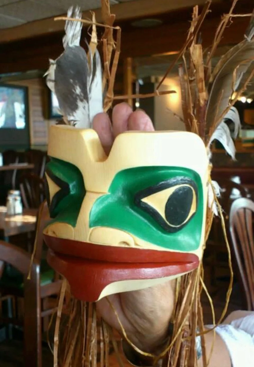 Frog Mask | Red Cedar, Cedar Bark, Synthetic Grass, Eagle Feathers | 15" x 20" x 6"